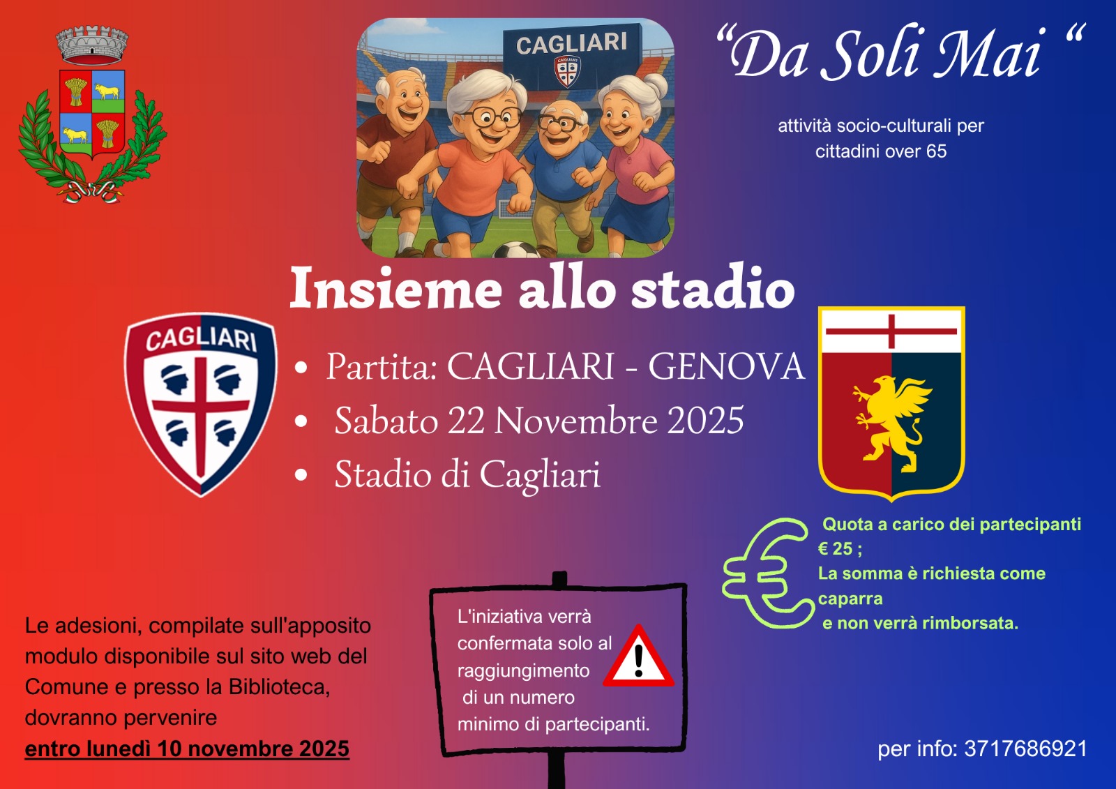 Progetto "Da soli mai" 29/10/2025 "Insieme allo stadio" - Domenica 22 novembre 2025 allo stadio di Cagliari per seguire la partita Cagliari - Genova Continua a leggere